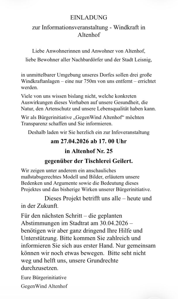 Wir als Bürgerinitiative „GegenWind Altenhof“ möchten Transparenz schaffen und Sie informieren.