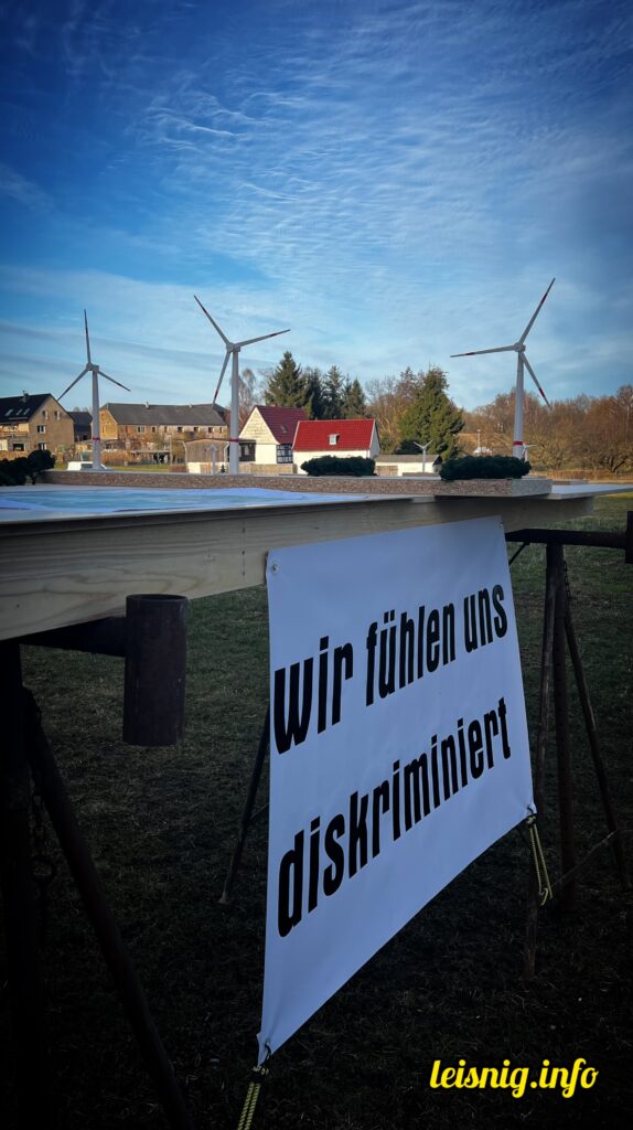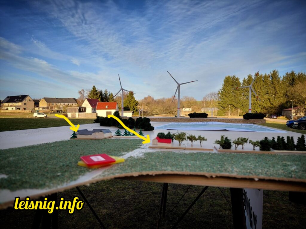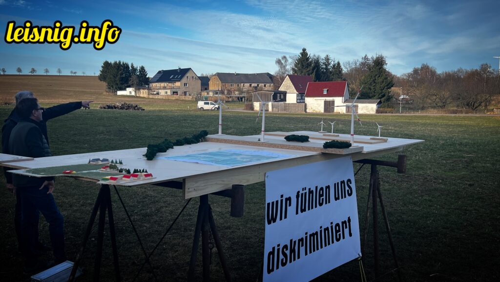 Eingeladen waren die Stadträte und alle interessierten Bürger. Etwa 50 Bürger kamen. Von allen Fraktionen außer der Linken war mindestens ein Vertreter vor Ort. Die BI Altenhof hatte sich für den späten Nachmittag am Donnerstag etwas sehr Beeindruckendes einfallen lassen: ein riesiges Modell sowie bearbeitete Bilder, die die Dimensionen der geplanten Anlagen (über 250 Meter hoch) und vor allem die Nähe zum ersten bewohnten Hof von Altenhof – nur 750 Meter – eindrucksvoll visualisierten. „Dagegen ist der Uniriese ein Zwerg.“ An den 80 Meter hohen und viel weiter entfernten Windkraftanlagen hätte sich bisher niemand gestört, die Neuen seien aber „eine ganz andere Hausnummer“. „Schattenwurf wird es bis Naunhof geben“, so ein Unternehmer aus Altenhof.